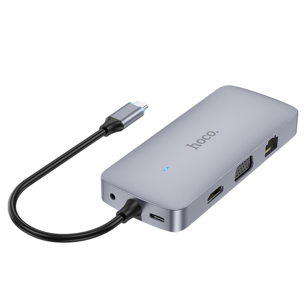 Мультиадаптер хаб Hoco HB33 10в1 Type-C to USB 3.0/ 2 USB 2.0/ Type-C/ HDMI/ VGA/ RJ45/ AUX/ SD/ TF PD 100W 0.18m сірий