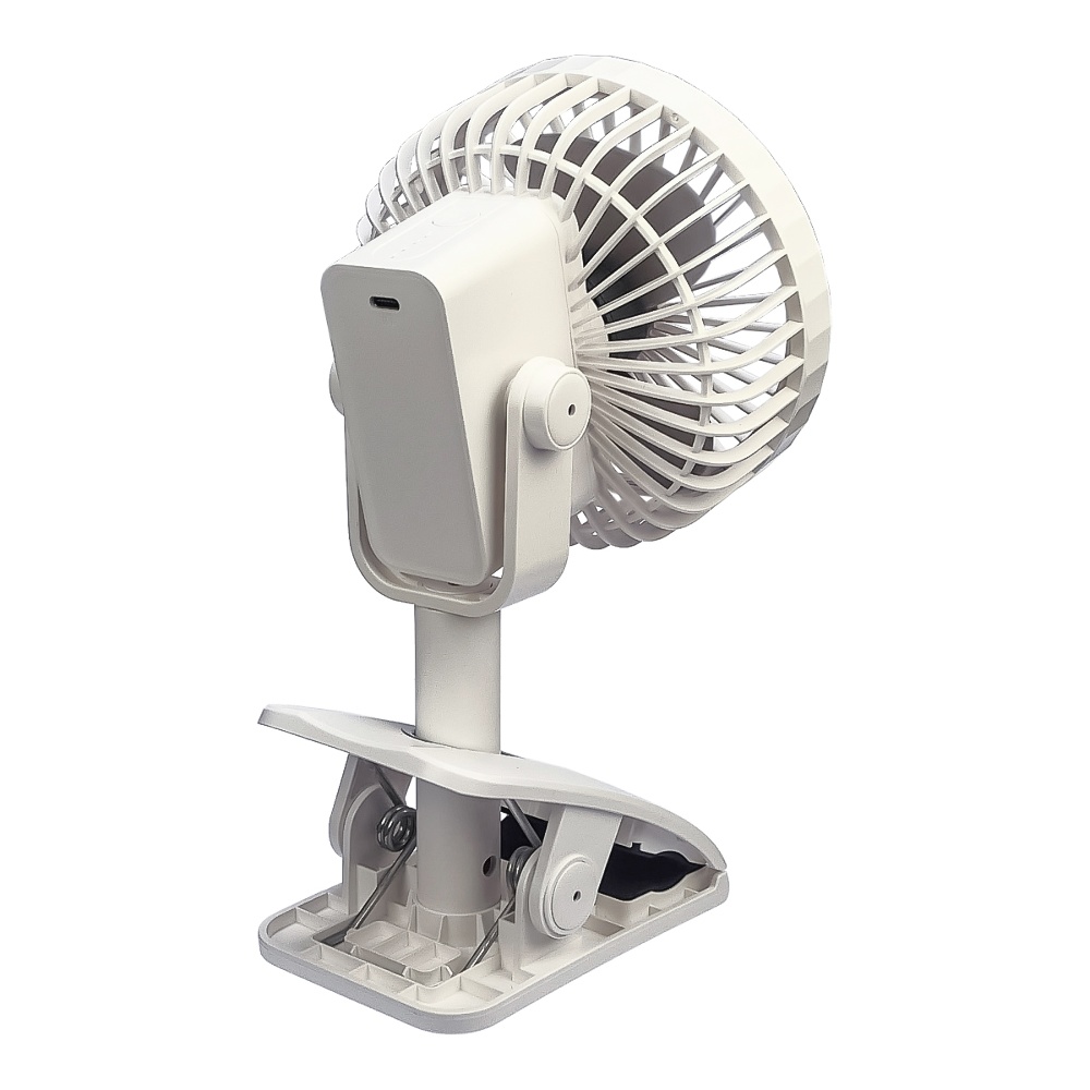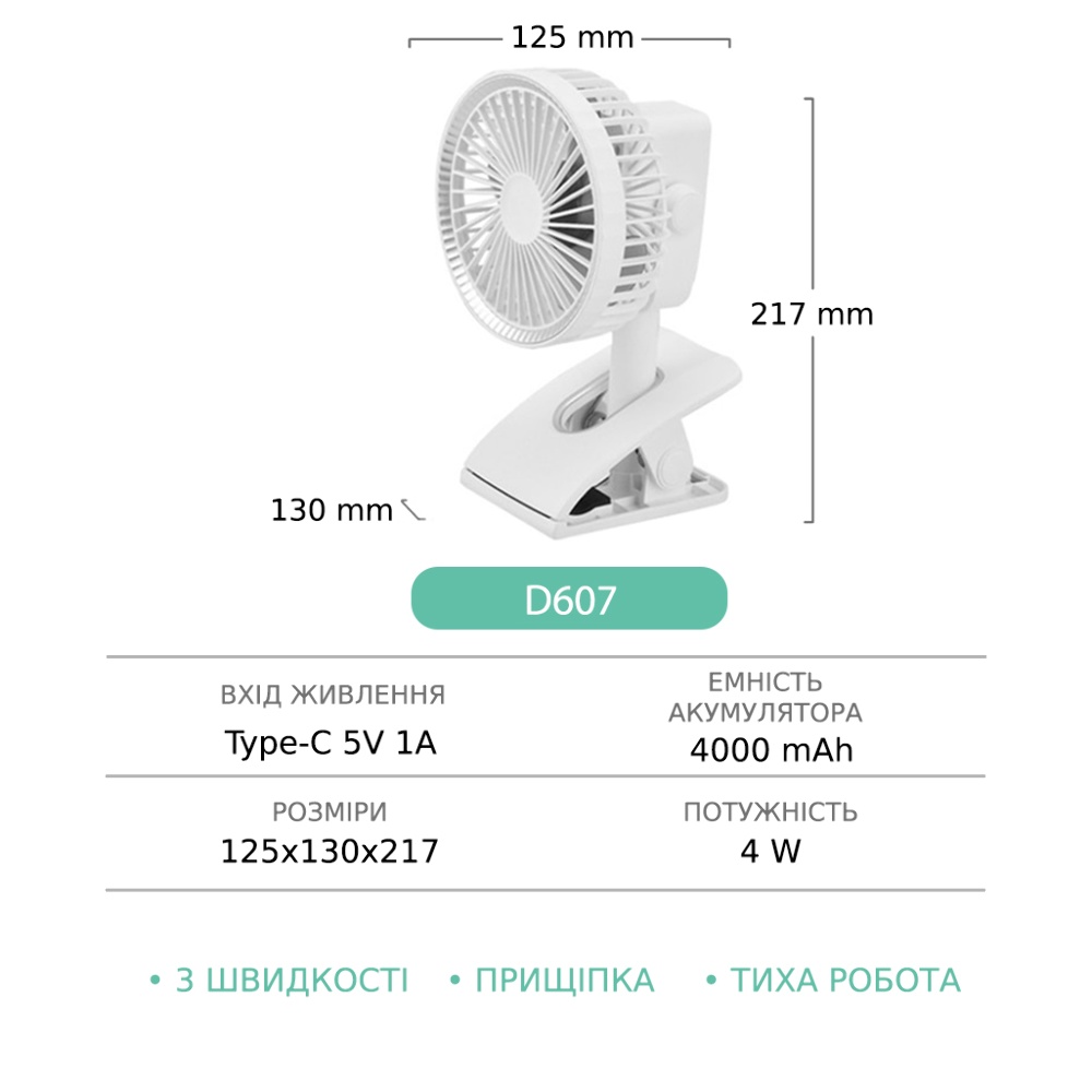 Настільний бездротовий вентилятор GXQC D607 з прищепкою білий - компактний та потужний портативний вентилятор з безщітковим двигуном. Оснащений 18650 літієвою батареєю ємністю – 4000 mAh, він забезпечить вам безперервний потік свіжого повітря до 8 годин. За рахунок можливості живлення від будь-якого USB порту 5V його можна підключити до мережного адаптера, повербанку або ноутбука за допомогою кабелю, що йде в комплекті.