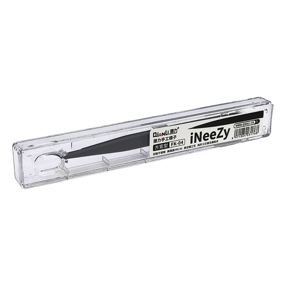 Пінцет у футлярі прямої QianLi iNeezy FK-04 призначений для зручного захоплення та утримання дрібних компонентів при ремонті електроніки. Має розміри 130 x 9 мм, наконечники з товщиною 0.15 мм і виготовлений зі сталі з твердістю HRC40, з чорним антистатичним покриттям.