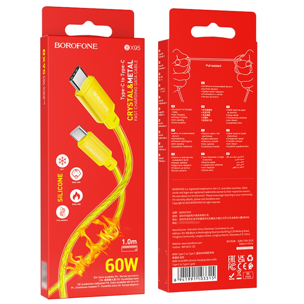 Кабель Borofone BX95 Type-C to Type-C PD 60W золотистий 1m забезпечує високу потужність зарядки до 60W для ноутбуків і 3A для мобільних телефонів. Виготовлений із прозорого силікону з алюмінієвою фольгою в техніці плетіння, він надає надійне та швидке з'єднання між пристроями.