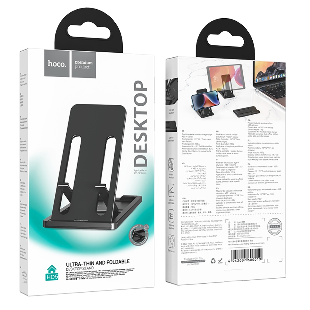 Настільний тримач Hoco HD5 чорний – це стильний та практичний пристрій для зручності використання мобільних телефонів. Виготовлений із міцних матеріалів, таких як алюмінієвий сплав, ABS та силікон, з використанням технології сонячного опіку та окислення.
