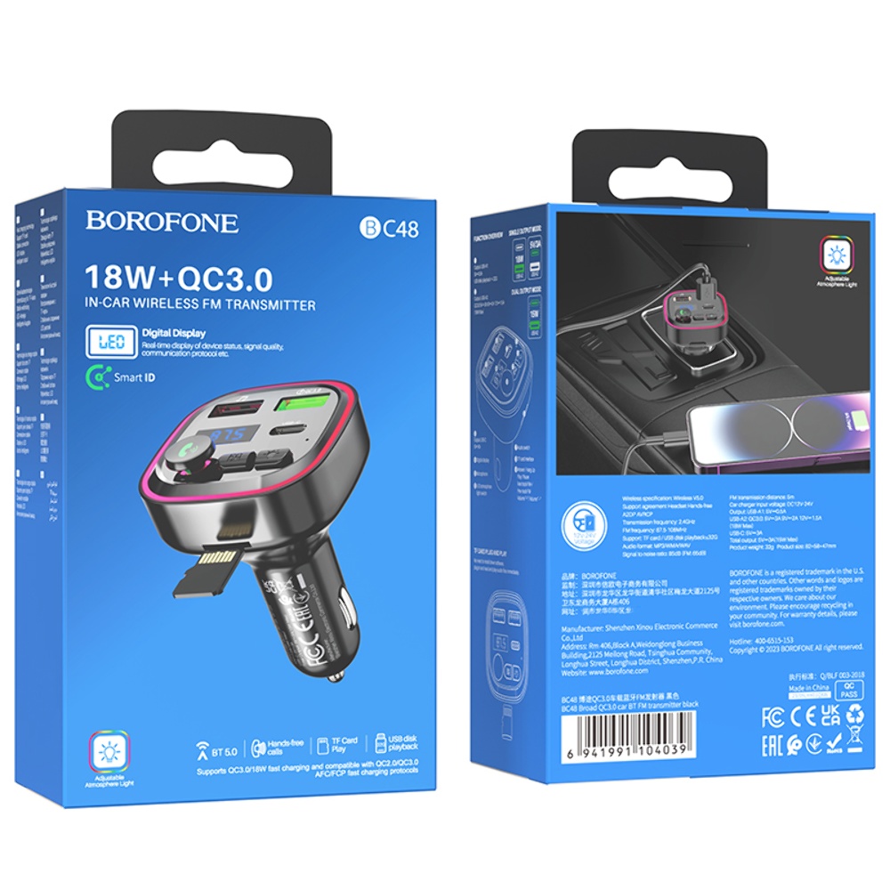 Автомобільний зарядний пристрій Borofone BC48 2 USB/Type-C/QC 18W з FM-модулятором (USB/TF card/Bluetooth) чорне – це універсальне рішення для всіх ваших зарядних потреб в автомобілі. Підтримка технології швидкого заряджання QC 18W та наявність FM-модулятора дозволяють насолоджуватися якісним звуком та заряджати пристрої одночасно. З двома USB-портами та підтримкою Type-C, цей пристрій стане незамінним компаньйоном у ваших поїздках.