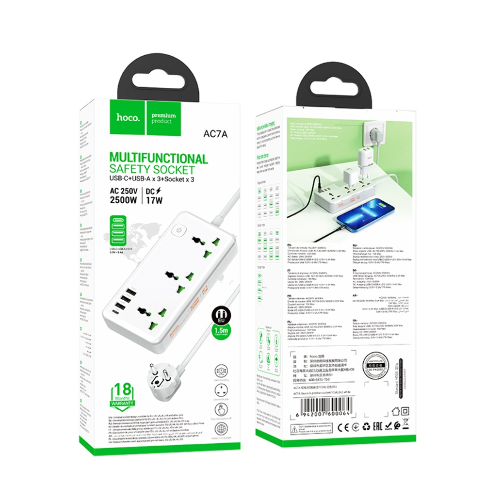 Мережевий зарядний пристрій подовжувач Hoco AC7A 3 USB/ Type-C 3 розетки 1.5m білий