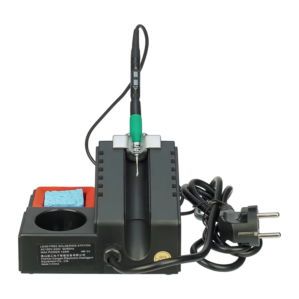 - Паяльна станція укомплектована практичною підставкою для паяльника, губкою для очищення, ємністю для зберігання різних дрібних інструментів та аксесуарів.