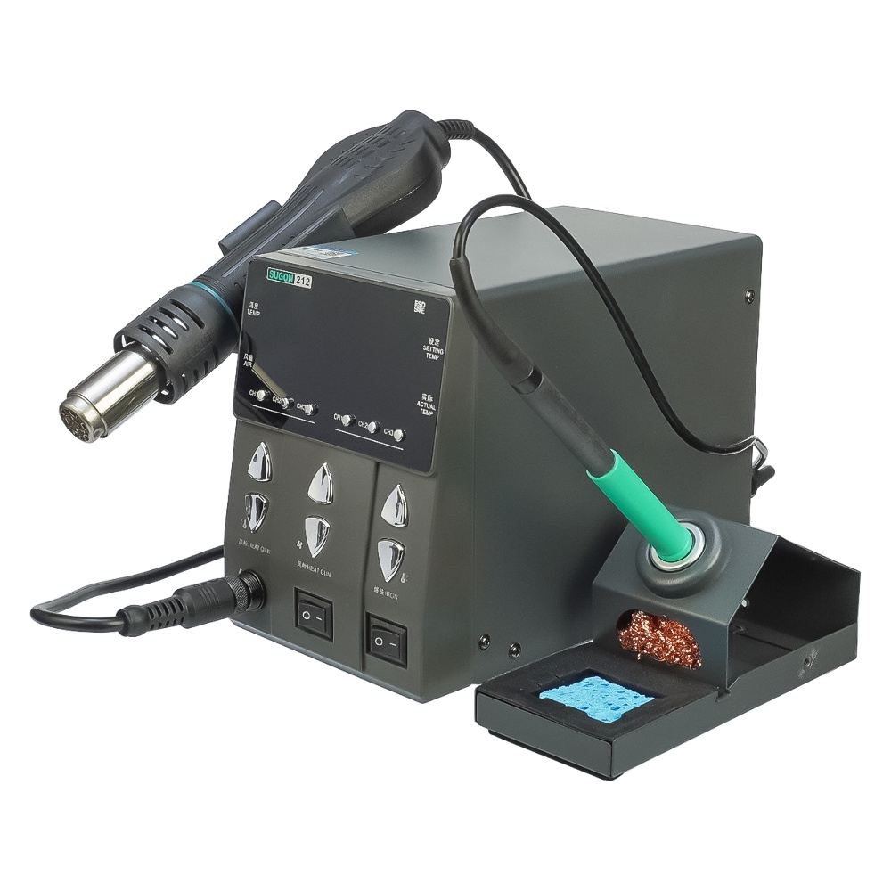 Паяльна станція прецизійна Sugon 212 (паяльник T12, 3 канали пам'яті, 200C - 450C, фен, 3 канали пам'яті, 100C - 500C, 760W) - це два незамінні інструменти в одному: паяльна станція та фен. Призначена для виконання тонких та складних паяльних робіт, таких як паяння мікросхем, електронних SMD-компонентів, дротів та інших дрібних елементів.Паяльні станції це ідеальне обладнання для сервісних центрів та майстерень, лабораторій, дослідницьких та навчальних закладів, а також для любителів та професіоналів, широко застосовуються у виготовленні та ремонті різноманітної електроніки: телефонів та планшетів, комп'ютерів та телевізорів та багато іншого.