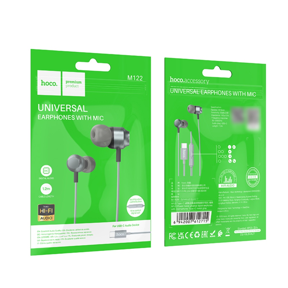 Навушники провідні вакуумні Hoco M122 з мікрофоном у сірому кольорі - це стильне та зручне рішення для прослуховування музики та спілкування.