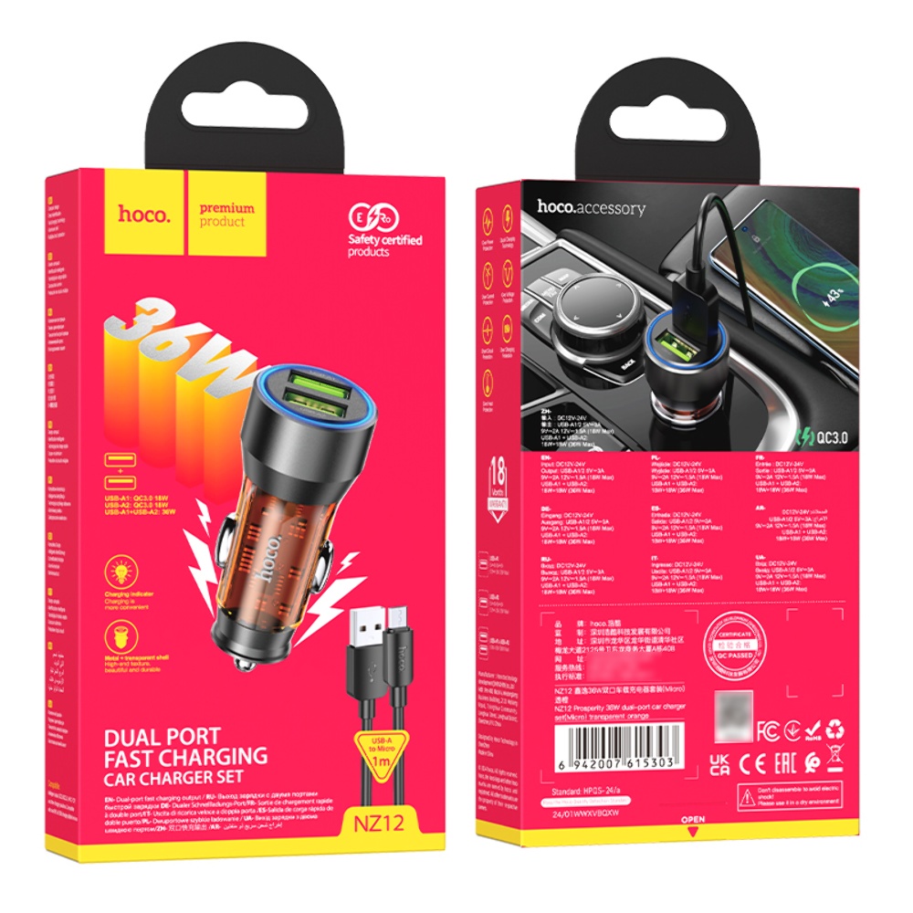 Автомобільний зарядний пристрій Hoco NZ12 2 USB QC 36W transparent orange + кабель USB to MicroUSB