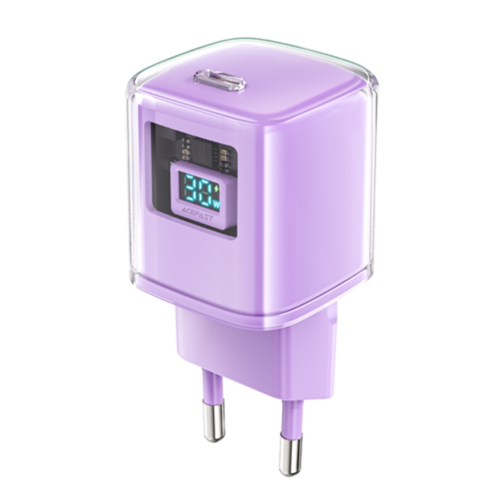 Мережевий зарядний пристрій Acefast A53 Type-C PD30W у фіолетовому кольорі забезпечує швидку та безпечну зарядку для різних пристроїв, що підтримують технологію USB-C Power Delivery (PD) та інші стандарти швидкого заряджання.