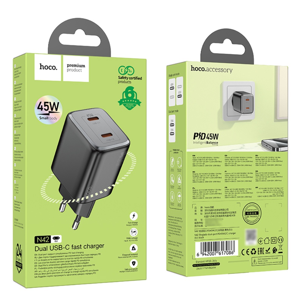 Мережевий зарядний пристрій Hoco N42 2 Type-C PD 45W у чорному кольорі — це потужний і компактний зарядний пристрій, який підтримує швидке заряджання різних пристроїв з інтерфейсом USB Type-C, включаючи ноутбуки, смартфони, планшети та інші гаджети.