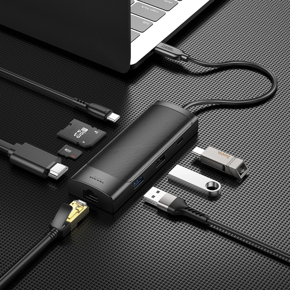 Адаптер-перехідник Hoco HB44 8-1 Type-C чорного кольору — універсальне рішення для розширення функціональності вашого пристрою з інтерфейсом Type-C. Цей компактний та легкий адаптер дозволяє підключити різні пристрої та аксесуари, включаючи HDMI, RJ45, SD/TF карти, USB3.0 та USB2.0 порти, а також PD для швидкого заряджання до 100 Вт. Завдяки підтримці передачі даних та зображень з високою роздільною здатністю, Hoco HB44 ідеально підходить для професійних та побутових завдань.