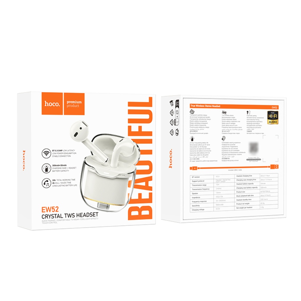 Бездротові навушники TWS Hoco EW52 вкладиші milky white — це стильні та зручні навушники, які забезпечать вам високоякісне звучання та комфорт при використанні. Завдяки Bluetooth 5.3 з чіпом JL AC6973, ви отримаєте стабільне з'єднання та відмінну якість звуку. Ємність батареї становить 300mAh для зарядного кейсу і 30mAh для кожного навушника, що дозволяє використовувати навушники до 4 годин без підзарядки.