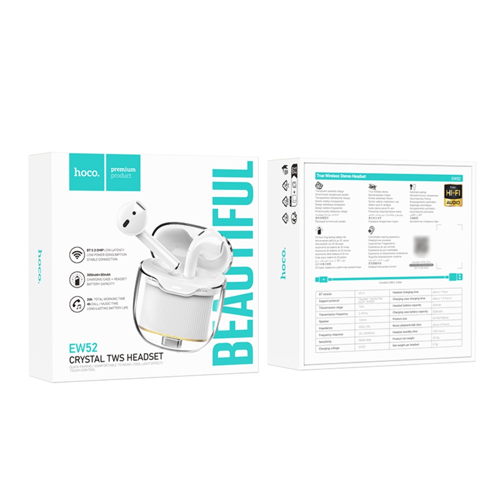 Бездротові навушники TWS Hoco EW52 вкладиші white — це стильні та зручні навушники, які забезпечать вам високоякісне звучання та комфорт при використанні. Завдяки Bluetooth 5.3 з чіпом JL AC6973, ви отримаєте стабільне з'єднання та відмінну якість звуку. Ємність батареї становить 300mAh для зарядного кейсу і 30mAh для кожного навушника, що дозволяє використовувати навушники до 4 годин без підзарядки.