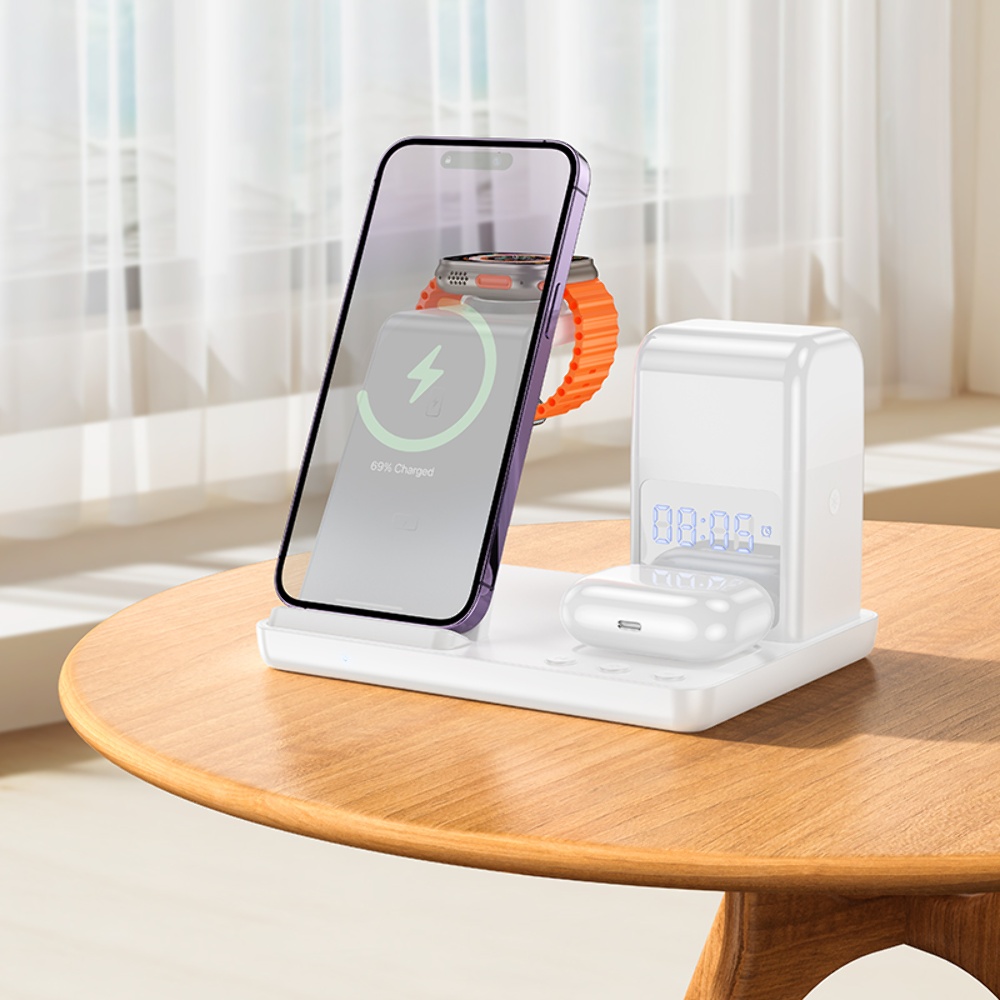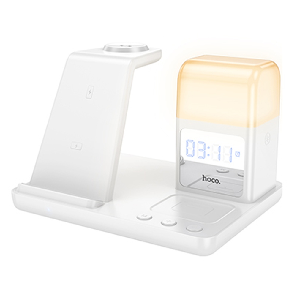 Бездротовий зарядний пристрій Hoco CQ9 3в1 з годинником white