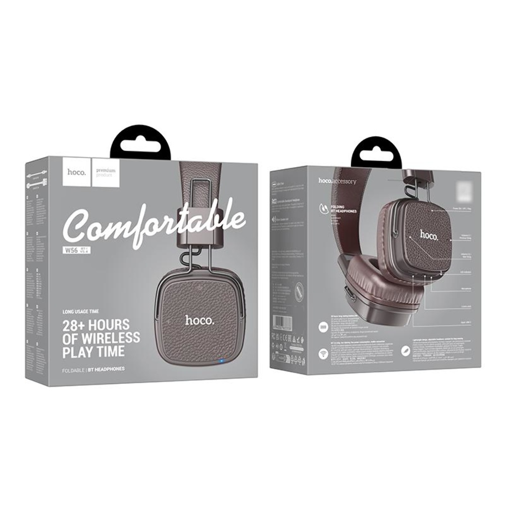 Бездротові наушники Hoco W56 накладні коричневого кольору забезпечують відмінну якість звуку та комфортне використання. З Bluetooth 5.4 та тривалим часом роботи, вони ідеально підходять для прослуховування музики та спілкування.