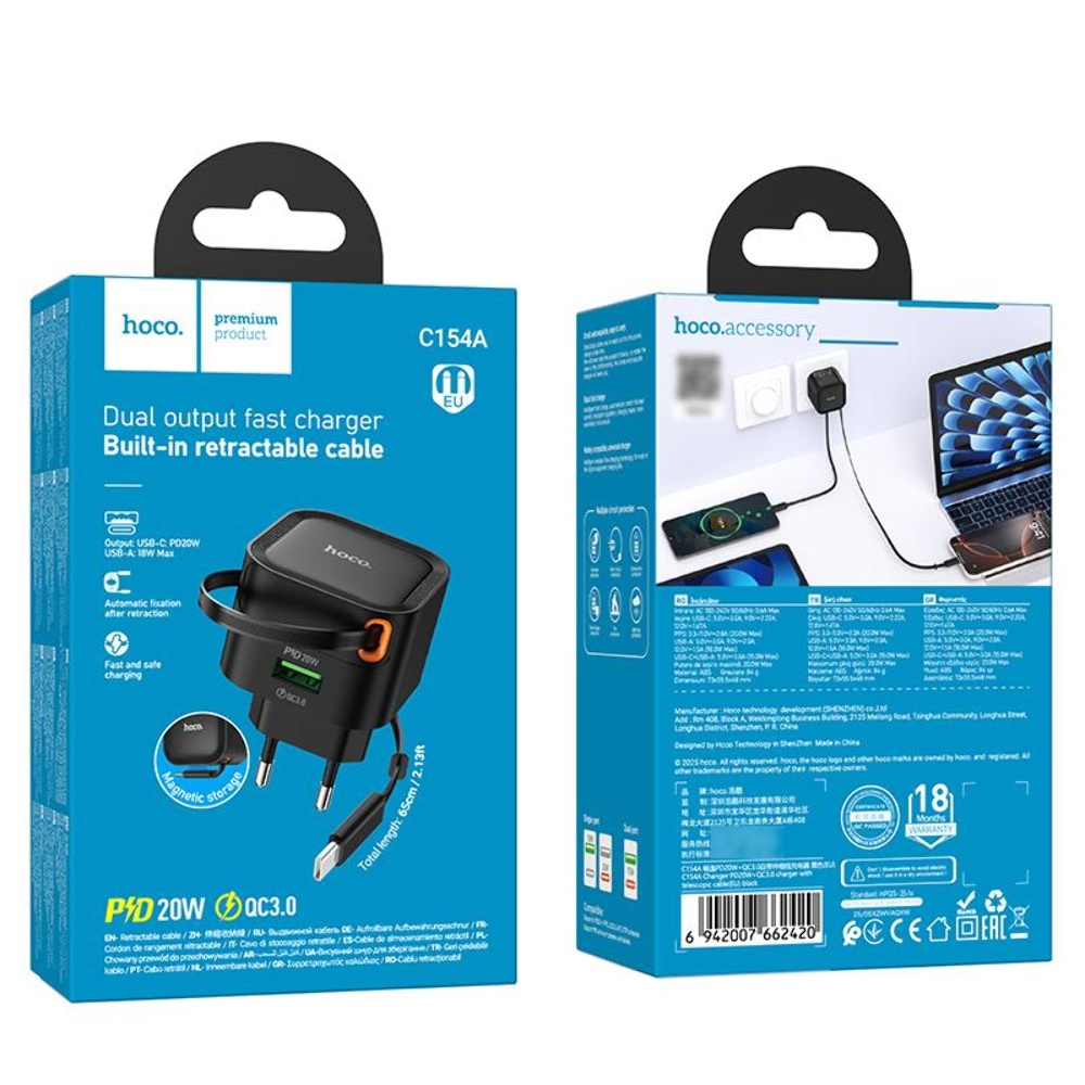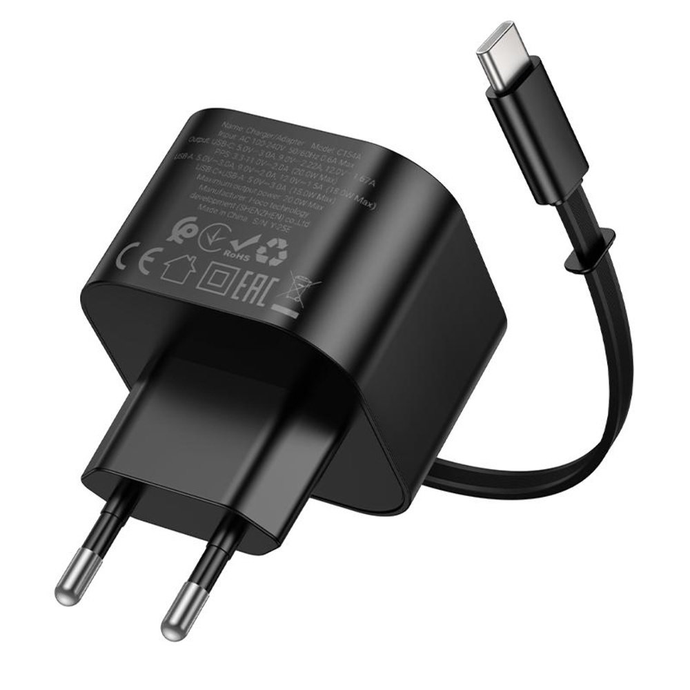 Мережевий зарядний пристрій Hoco C154A PD QC black - це надійний аксесуар для швидкої зарядки ваших пристроїв. Модель C154A підтримує швидку зарядку Power Delivery і Quick Charge, що дозволяє ефективно заряджати смартфони та інші гаджети.