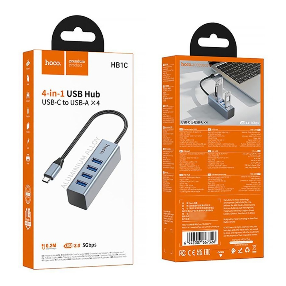 Адаптер переходник Hoco HB1C 4в1 Type-C to 4 USB 3.0 (F) metal gray